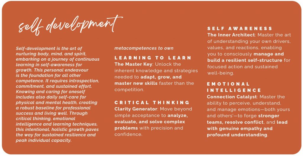 Unlike job-specific skills, metacompetences are universal to be understood as a basis for the capacity to learn and evolve. Training in metacompetences focuses on optimizing the individual’s „operating system,“ ensuring that any new technical training yields maximum, sustained professional impact.