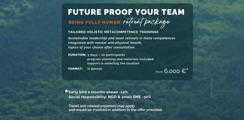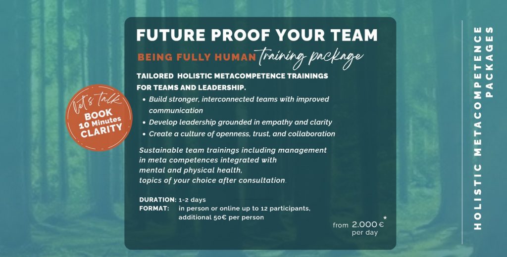 Metacompetence training is insufficient without the foundation of vitality. Our unique approach is the antidote: we seamlessly integrate essential physical and mental selfcare — from self awareness to intentional movement — directly into team coaching and learning processes. This ensures our participants develop helpful routines to independently maintain these practices, integrating them fully into their private and professional lives throughout the day, each time taking a small, doable, conscious step.