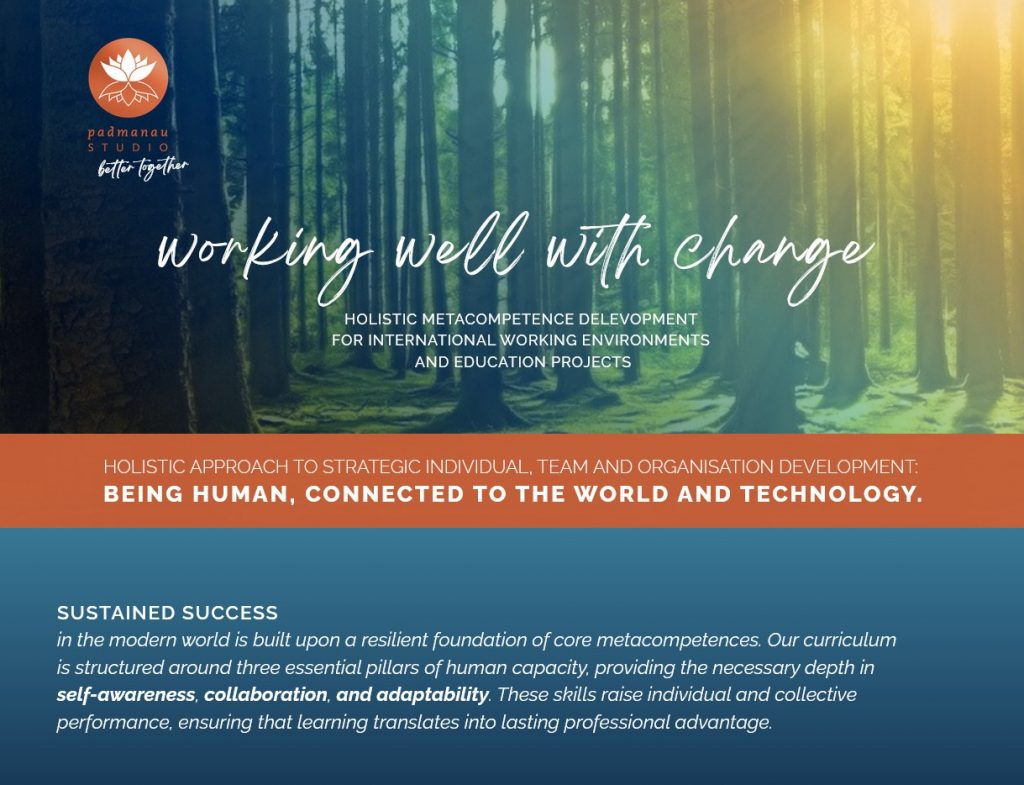 Our approach integrates meta competences in self-development, working in teams and leadership, dealing with change with yoga and mindfulness to foster physical and mental health for resilience in times of change.