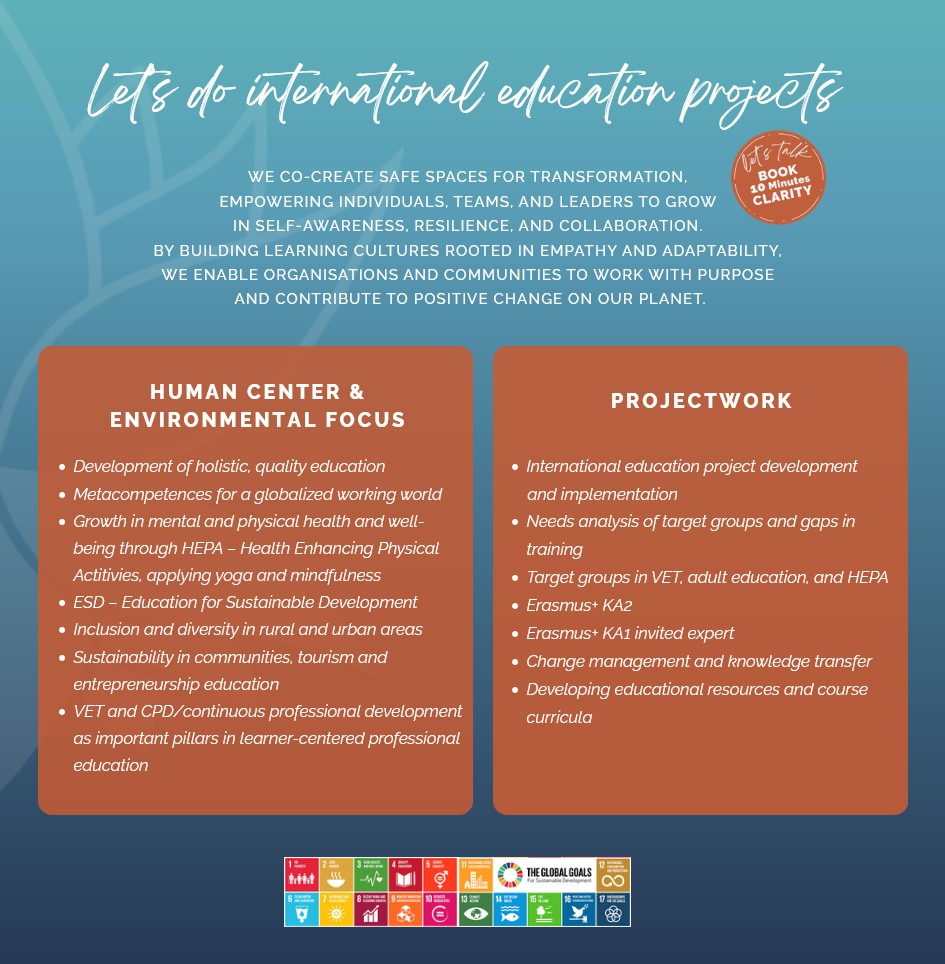 Let’s work together in metacompetence trainings and EU projects with a focus on individual wellbeing and resilience.